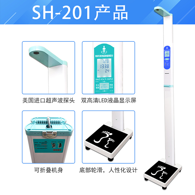 上禾SH-201打印款智能雙屏電子身高體重測量儀,作為專業(yè)體檢設備,采用美國進口Sens Comp超聲傳感器,同時具備環(huán)境溫度自動補償功能,身高分度0.01cm,體重分度0.01kg;雙屏設計均為液晶顯示屏,上屏5寸,顯示身高、體重、BMI身體健康指數(shù),下屏3寸,顯示二維碼和使用單位宣傳語;全自動測量、液晶電子顯示、語音播報三合一,數(shù)據(jù)可通過RS232接口、藍牙等功能進行傳輸保存;自動高速熱敏打印,結果易于儲存,支持微信掃碼,測量結果直達手機。