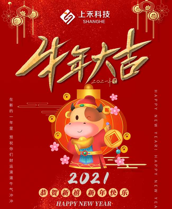 新年的祝福和希望,已經踏著月光靜靜地融在雪地里,它們隨著春天生長,送給您一年的豐碩與芬芳!牛年快樂!萬事如意!新年的鐘聲已經響起,愿這吉祥的鐘聲能為您及家人帶來平安、幸福、健康和快樂!上禾科技全體員工給大家拜個早年啦!